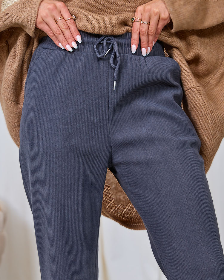 - Pantalon large sensationnel pour femme en velours côtelé. Le modèle a une ceinture élastique avec des liens réglables. En outre, deux poches à glissière sur le devant. Un hit de cette saison !