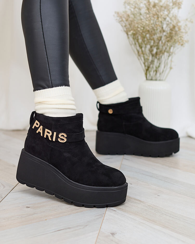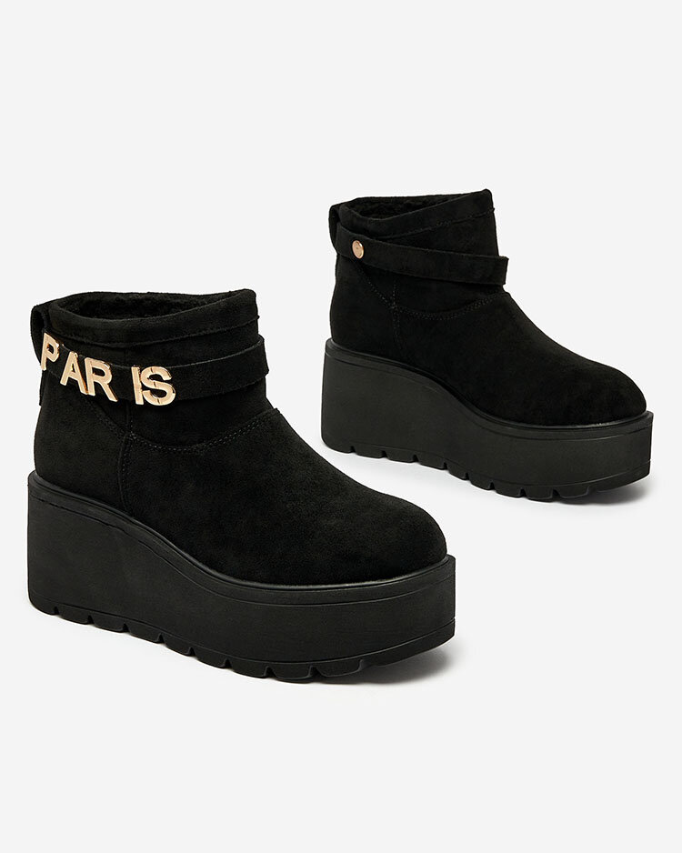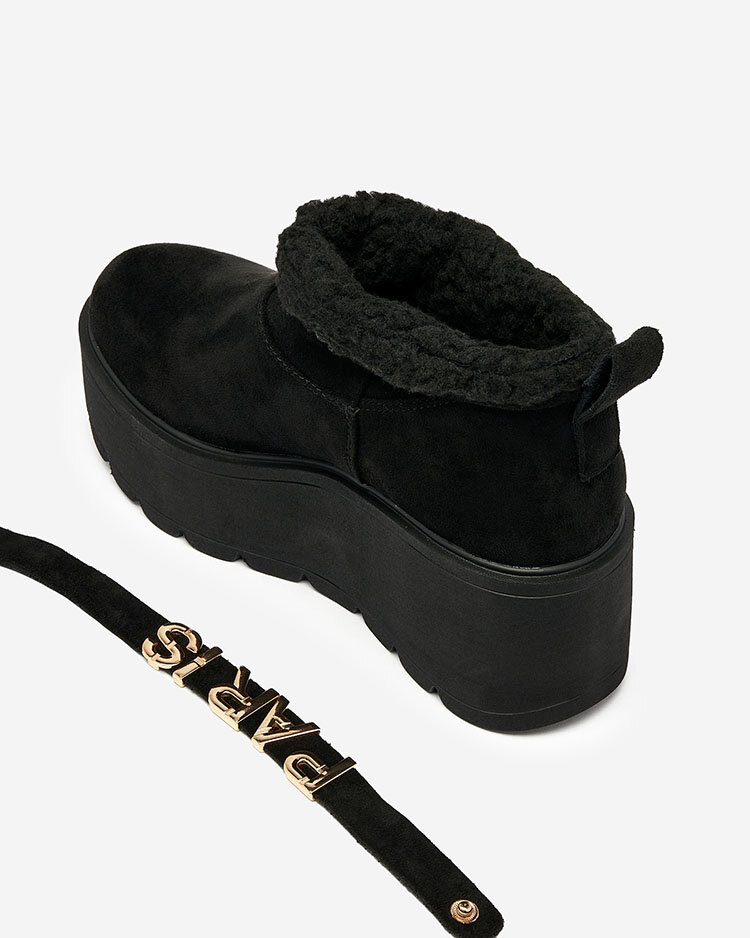 - Mega bottes de neige isolées pour femmes en cuir suédé écologique. Elles ont un centre rempli de fourrure à la peau de mouton. De plus, l'as détachable est décoré d'une inscription. Chaussures à plateforme haute - parfaites pour les tenues décontractées