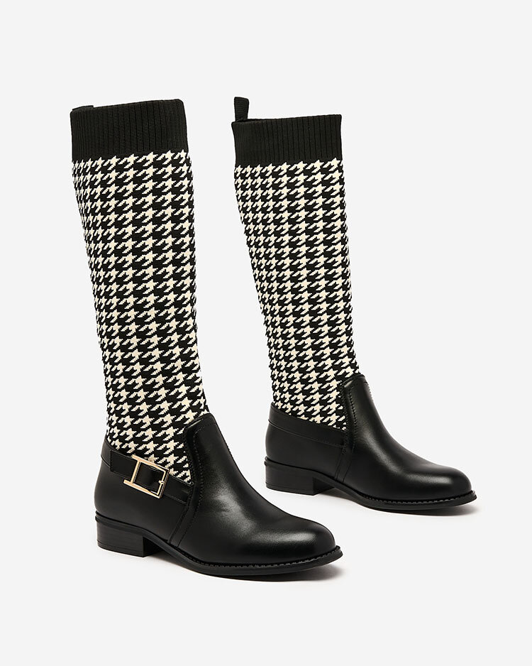 - Bottes montantes pour femme réalisées à partir d'une combinaison de cuir écologique et de tissu élastique. Modèle à enfiler, décoré d'un motif en pepit, isolé à l'intérieur avec une semelle intérieure en fourrure. Le talon plat ajoute au confort et à la c