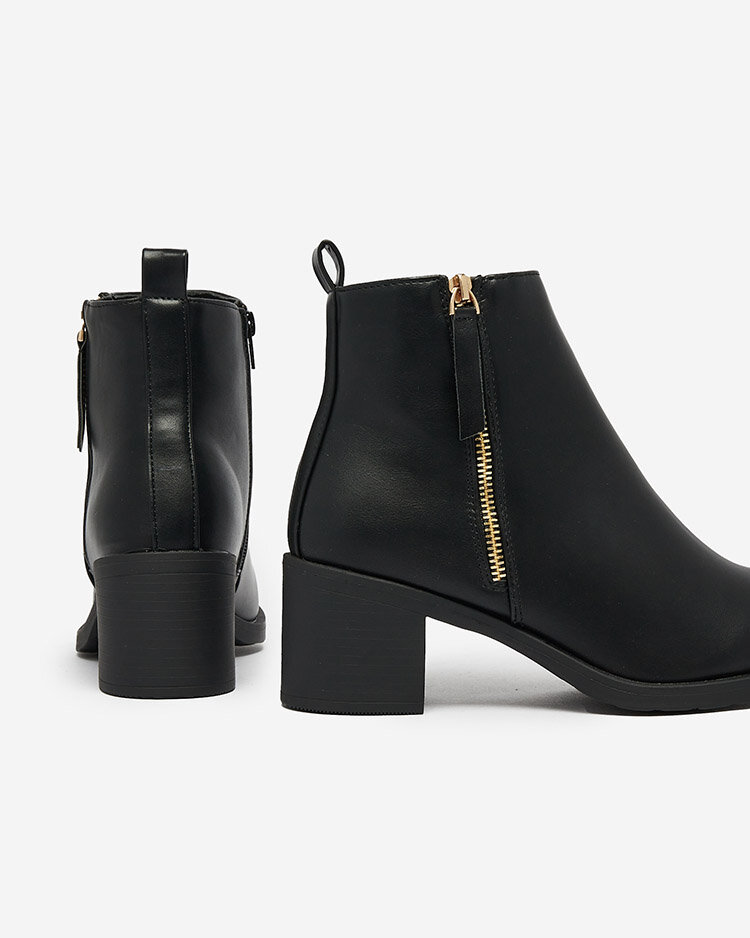 • Bottes basses à talon aiguille pour femmes. La tige est en cuir écologique, l'intérieur est isolé avec de la fourrure. La chaussure est fermée par une fermeture éclair. Un excellent choix pour l'automne !