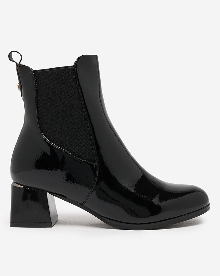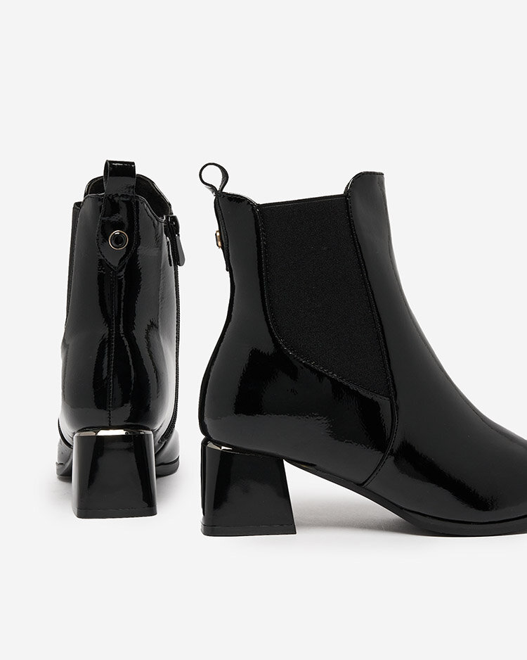 - Bottes élégantes pour femmes à tige basse. La tige est en cuir verni écologique, l'intérieur est isolé avec de la fourrure. Les chaussures sont fermées par des fermetures éclair sur les côtés. Un excellent choix pour l'automne !
