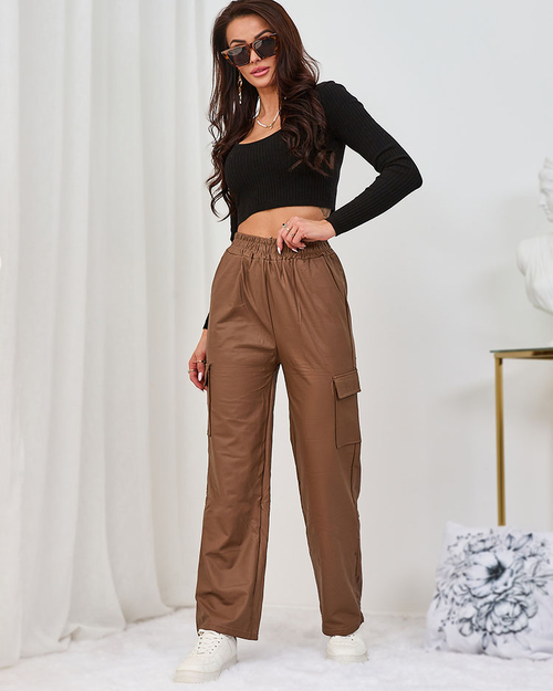 - Pantalon de combat large pour femme Cult, en cuir écologique. Le modèle est doté d'une ceinture élastique extensible et de quatre poches à glissière. Parfait pour la vie de tous les jours ! NOTE : Précision des mesures (+/-) 1 cm.