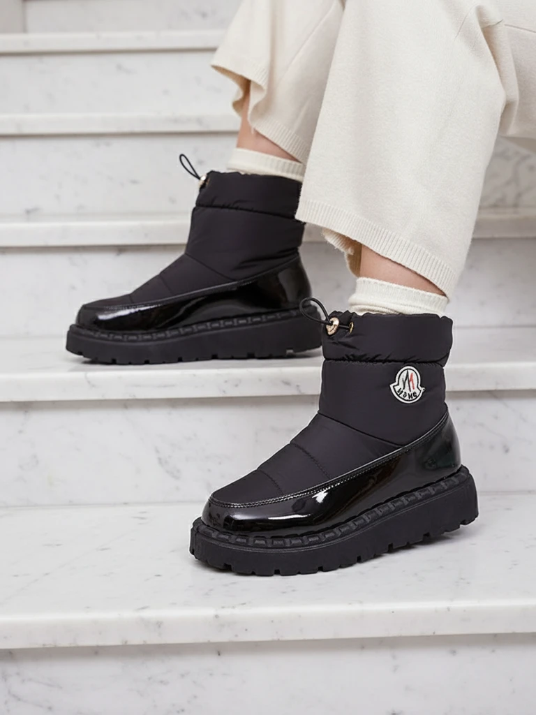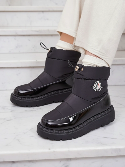 - Bottes de neige à enfiler pour femme intemporelles. Modèle à tige en toile cirée a'la et empiècements en éco-cuir laqué. Isolées à l'intérieur sous forme de fourrure, les chaussures s'enfilent et sont dotées d'une trépointe. Parfaites pour la saison froid