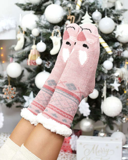 • Magnifiques chaussettes épaisses pour femmes avec un motif de Noël et un fond antidérapant. L'intérieur est isolé avec de la peau de mouton blanche et chaude. Les chaussettes seront parfaites pour les soirées plus froides.