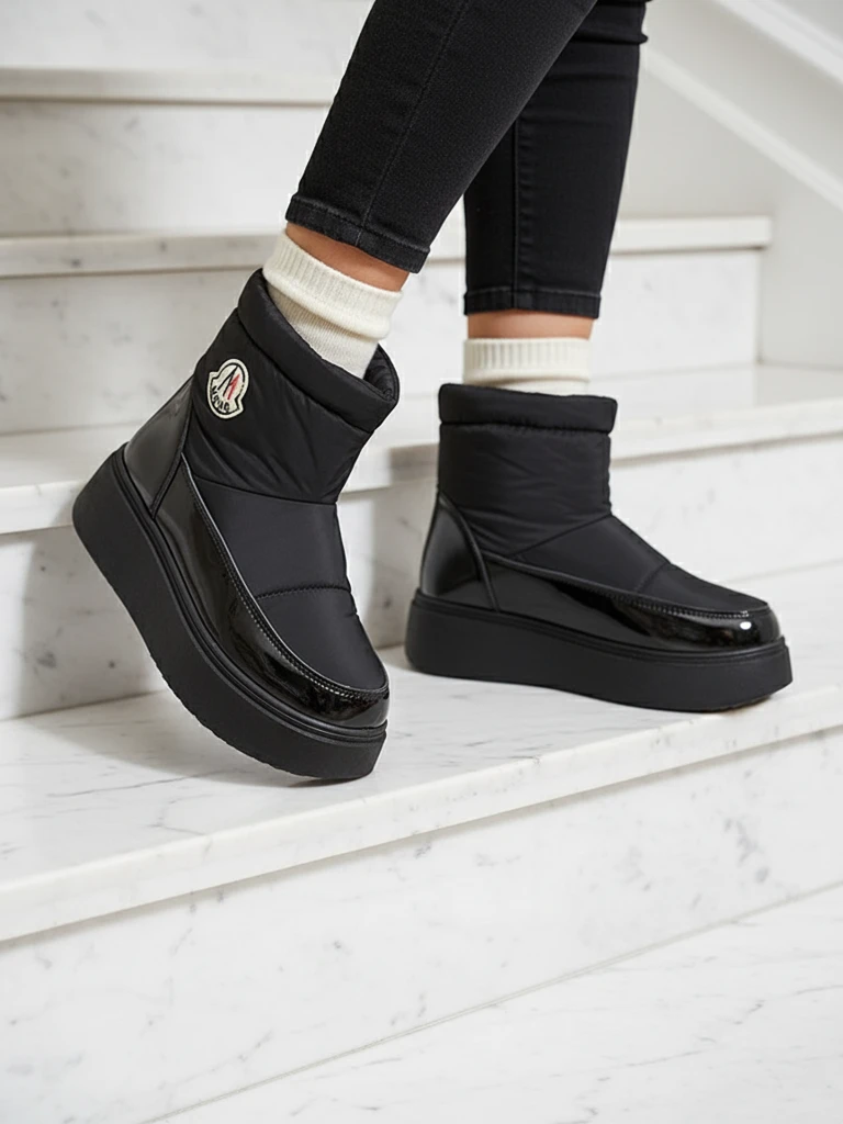 • Bottes de neige à enfiler pour femme intemporelles. Modèle avec tige en matériau a'la cerata et empiècements en éco-cuir laqué. Isolées à l'intérieur sous forme de fourrure, les chaussures s'enfilent et sont dotées d'une trépointe. Parfaites pour la saiso