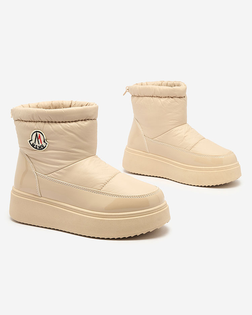 - Bottes de neige à enfiler pour femme intemporelles. Modèle avec tige en matériau a'la cerata et empiècements en éco-cuir laqué. Isolées à l'intérieur sous forme de fourrure, les chaussures s'enfilent et sont dotées d'une trépointe. Parfaites pour la saiso