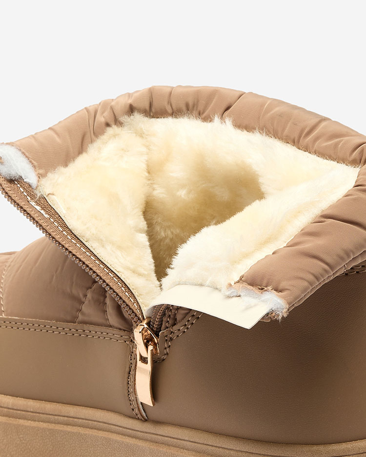 • Bottes de neige intemporelles pour femme. La tige est en matériau a'la cerata et les empiècements en cuir écologique. Isolées à l'intérieur sous forme de fourrure, les chaussures sont zippées et dotées d'une trépointe. Idéales pour la saison froide !