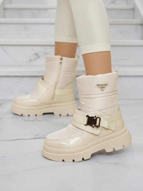 - Bottes de neige pour femme avec tige en matériau a'la cerata et cuir verni écologique. Intérieur isolé en fourrure artificielle, fermeture à glissière et velcro. Idéales pour la saison froide !