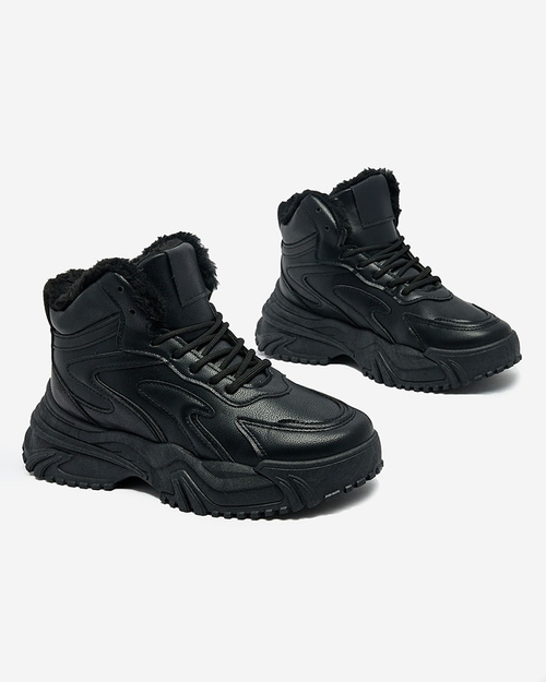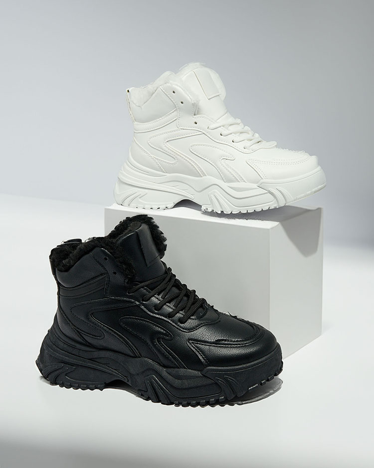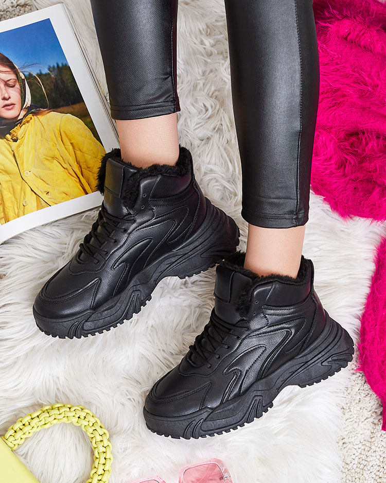 - Baskets sportives pour femme sur une semelle plus épaisse. Dessus lacé, en cuir écologique. Intérieur entièrement isolé avec de la fourrure. Idéales pour les tenues de sport !
