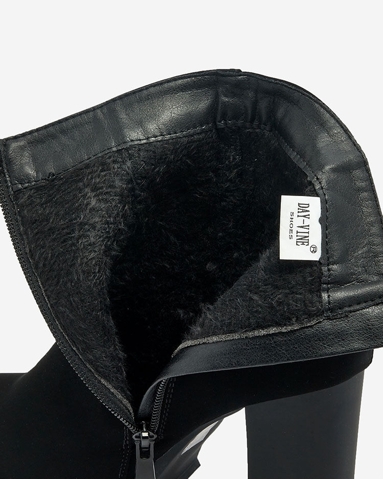 - Les bottes élégantes pour femme en cuir écologique nubuck mat sont idéales pour les jours plus froids. La tige est zippée sur le côté, isolée avec de la fourrure douce à l'intérieur. Modèle à tige plus haute et nez rond.