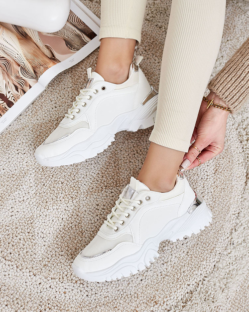 • Baskets de sport pour femmes en cuir écologique. La semelle intérieure est en tissu. Le modèle est lacé, sur une semelle solide avec un insert argenté à l'arrière. Elles seront un excellent accessoire pour le style de tous les jours.