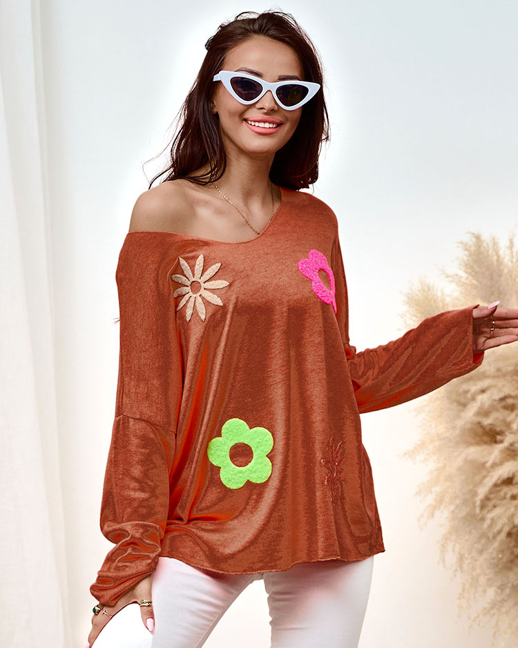 • Pull pour femme avec une encolure en cœur en tissu agréable. Le modèle a des manches longues et des patchs en forme de fleurs. Une base parfaite pour les tenues d'hiver !