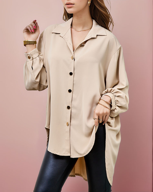 • Sensationnelle chemise femme à manches longues. Le modèle avec col est boutonné. Indispensable dans l'armoire de chaque femme !