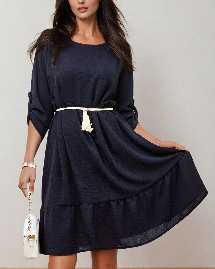 - Robe femme décontractée longueur genou avec manches longues retroussées et encolure ronde. Ceinture incluse. Incontournable de cette saison ! NOTE : Précision des mesures (+/-) 1 cm. Dimensions mesurées à plat.