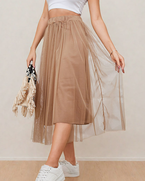- Jupe midi double épaisseur pour femme intemporelle. Le modèle a une doublure en maille et tulle, ainsi qu'une large ceinture élastique qui souligne parfaitement la taille. Cette jupe est un excellent accent pour votre look de tous les jours !
