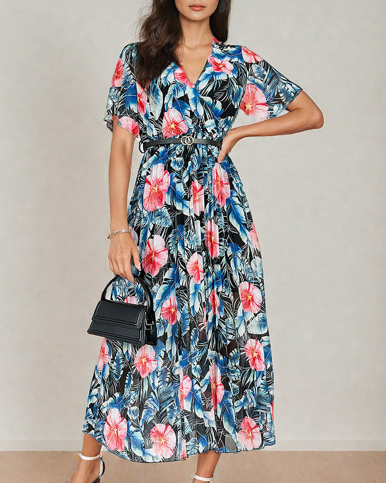- Une robe unique pour femme en tissu léger avec un motif floral. Elle est dotée d'une bande élastique à la hauteur de la taille. Le produit est de longueur midi, a des manches courtes et une bordure plissée. Une ceinture est également incluse. Sentez l'été