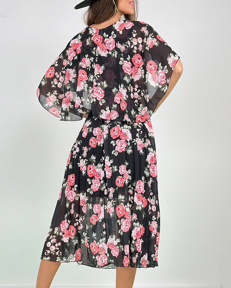 - Une robe unique pour femme en tissu léger avec un motif floral. Elle est dotée d'une bande élastique à la hauteur de la taille. Le produit est de longueur midi, a des manches courtes et des bordures plissées. Sentez l'été dans ce modèle !
