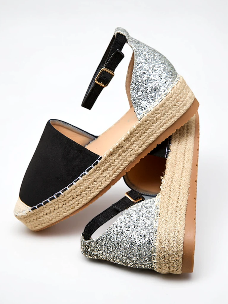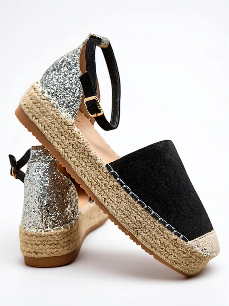 - Espadrilles uniques pour femme en cuir éco-daim et tissu avec paillettes. Semelle intérieure en cuir écologique. Semelle plate décorée d'un cordon de jute pour le confort. Fermées par une boucle. Un complément parfait aux styles d'été !