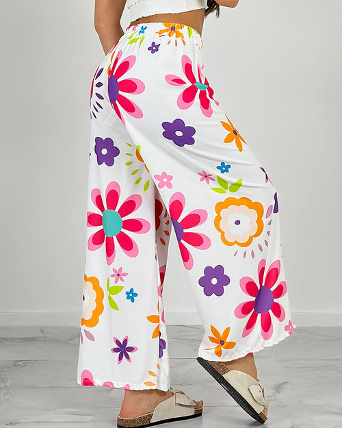 • Pantalon large à motif floral pour femme. Modèle à taille moyenne, avec un élastique et des liens à la taille, a des poches sur le devant. Mode et confort en un !