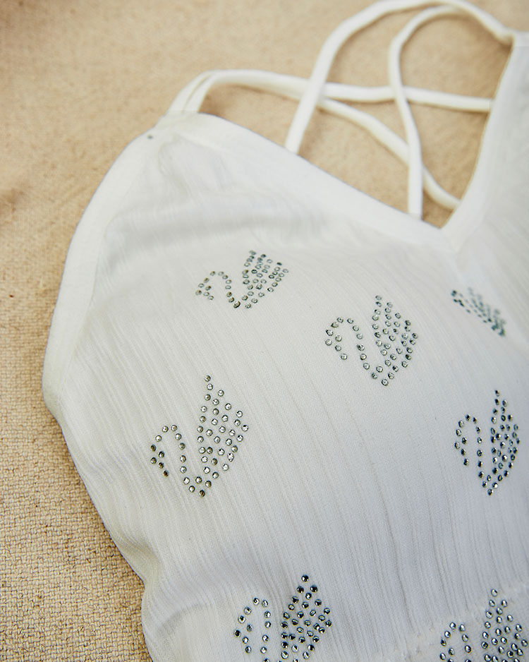 - Soutien-gorge de sport pour femme en matière élastique et agréable. Modèle avec bretelles croisées non réglables, sans fermoir et avec inserts amovibles, finies en bas par un large élastique et décorées de zircons. Il s'adapte parfaitement au corps.