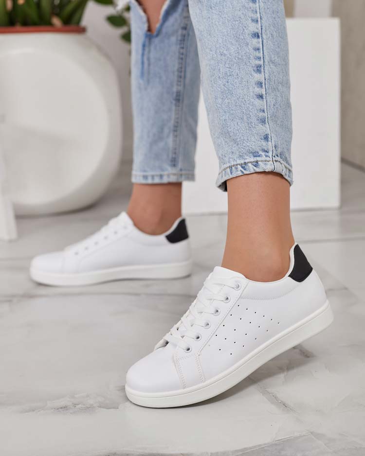 - Chaussures de sport pour femme en cuir écologique et semelle intérieure en tissu. Modèle sur semelle plate. La tige est lacée. Elles seront parfaites pour un style de tous les jours !