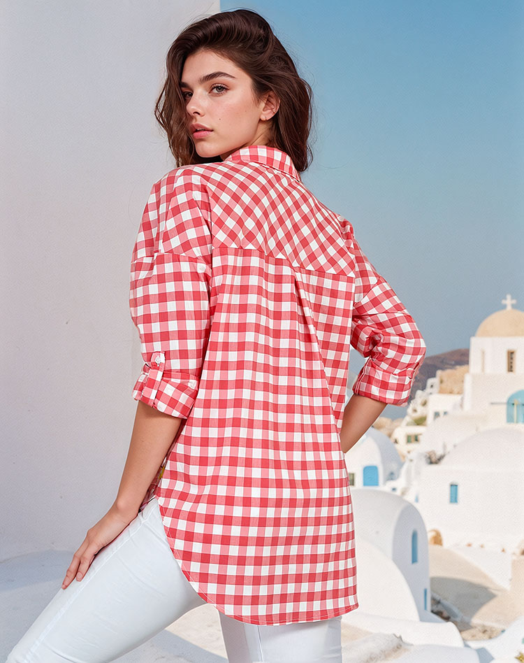 - Sensationnelle chemise à carreaux pour femme avec manches longues et retroussées. Le modèle à col est boutonné. Indispensable dans la garde-robe de chaque femme !