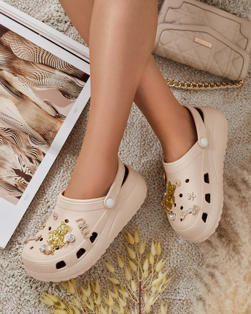 - Superbes tongs en caoutchouc ajourées pour femme sur une semelle plate. Elles ont des ornements amovibles en zircon sur le dessus. Un choix parfait pour les vacances !