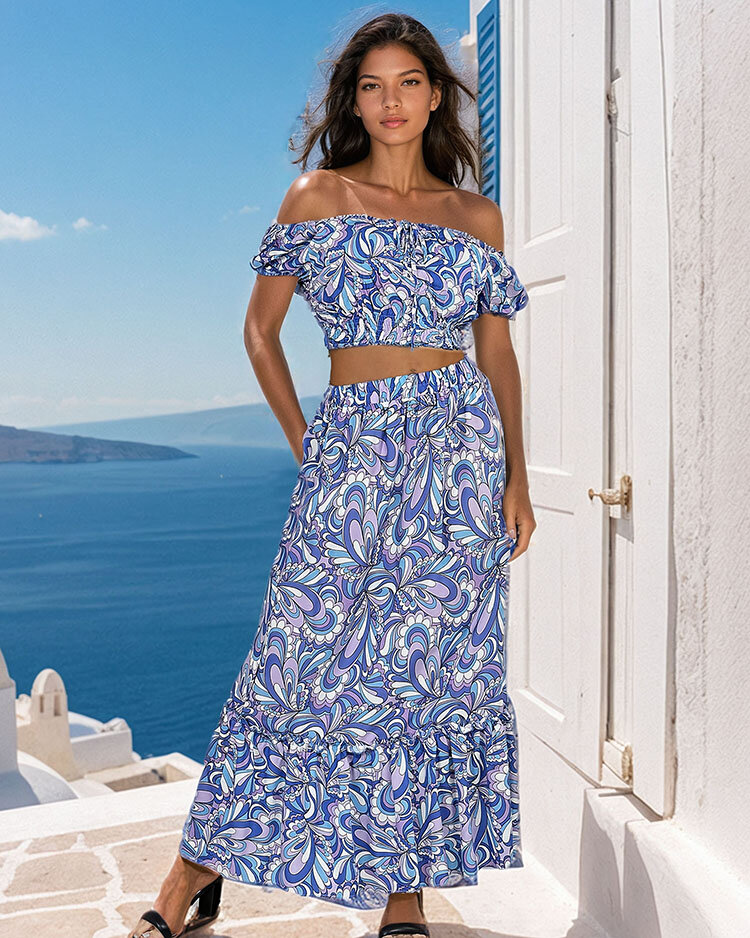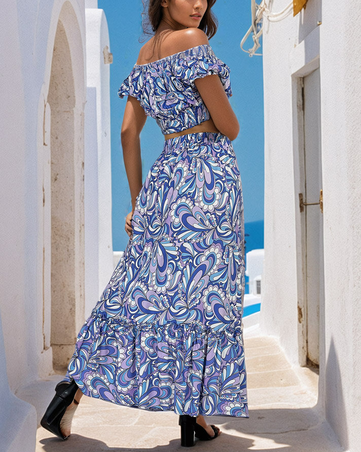 - Ensemble à motifs pour femmes en été, en tissu agréable et léger. Le haut court de style espagnol a une encolure ronde et une taille élastique. La jupe longue a une ceinture élastique et des volants décoratifs. NOTE : Précision des mesures (+/-) 1 cm.