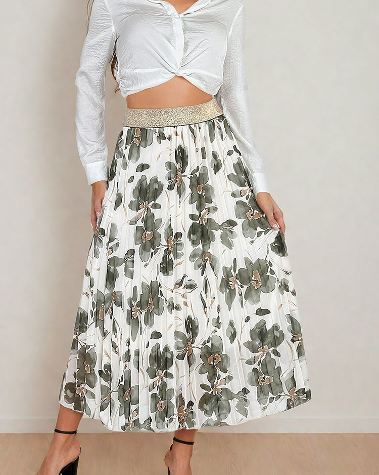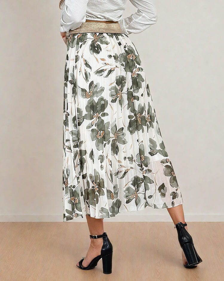 • Jupe midi plissée pour femme. Le modèle est doté d'une ceinture élastique qui souligne parfaitement la taille. De plus, elle est décorée d'un motif floral. Cette jupe est un excellent accent pour votre look de tous les jours !