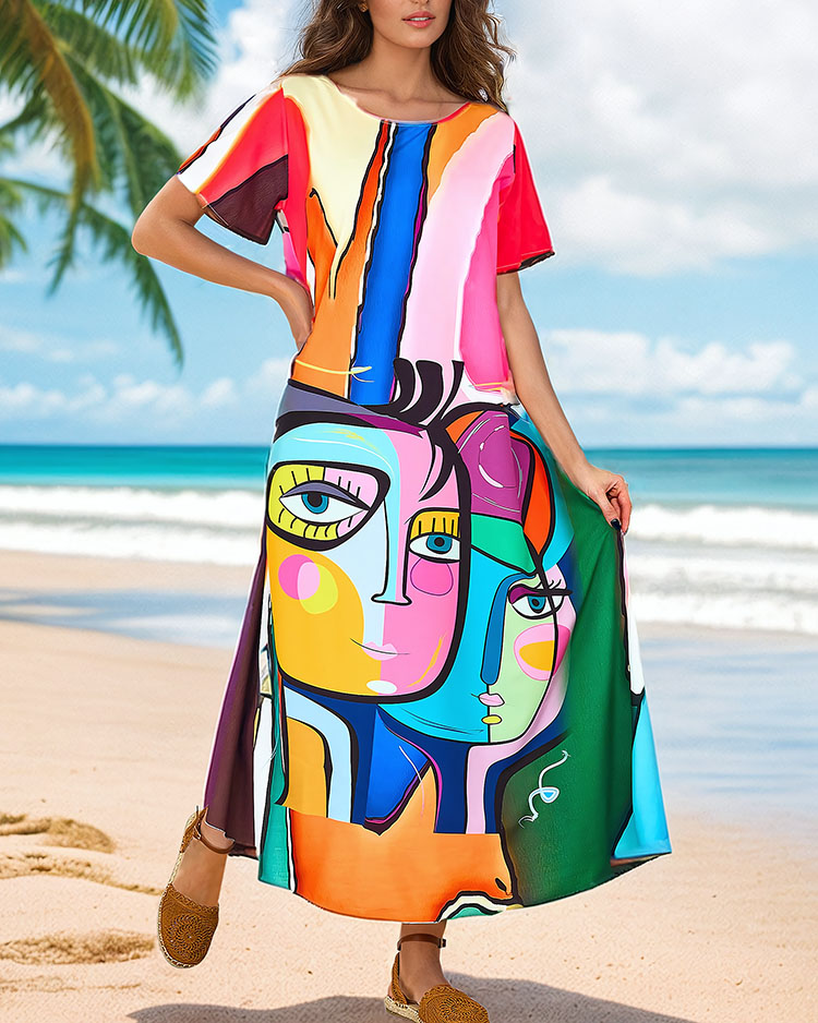 - Robe midi pour femme à encolure ronde et manches courtes. Fabriquée dans une matière agréable. Le modèle présente un imprimé décoratif. Une base parfaite pour tous les jours !