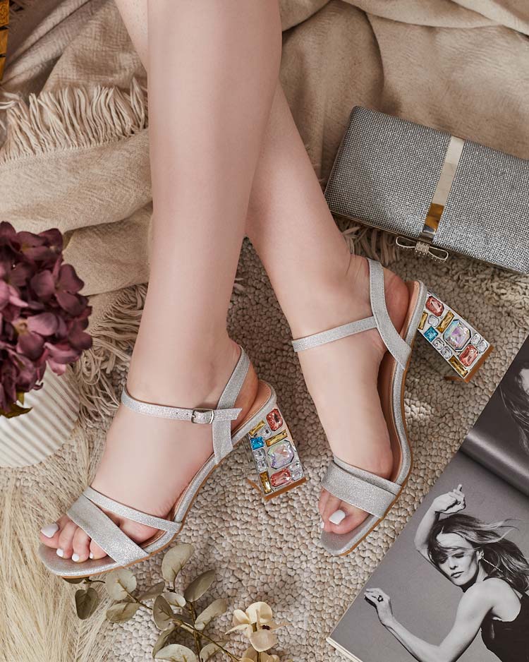 - Sandales recouvertes de tissu avec paillettes sur un talon haut avec strass, fermées par une boucle. Semelle intérieure en cuir écologique. Un mélange de style et de confort. Le talon solide donne de l'assurance à la démarche. Parfaites pour toutes les oc