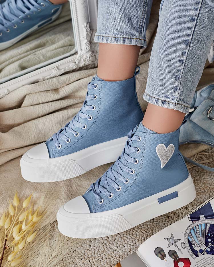 - Baskets de sport élégantes pour femme en tissu, avec une décoration en forme de cœur. Le modèle repose sur une plateforme confortable. La tige est lacée. Idéales pour créer des tenues de tous les jours !