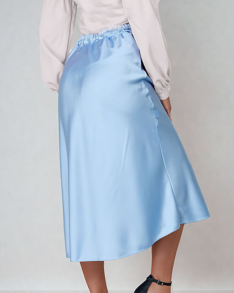- Jupe midi femme intemporelle. Le modèle est doté d'une ceinture élastique qui souligne parfaitement la taille. Fabriquée dans une matière agréable, le satin. Cette jupe est un excellent accent pour votre look de tous les jours !