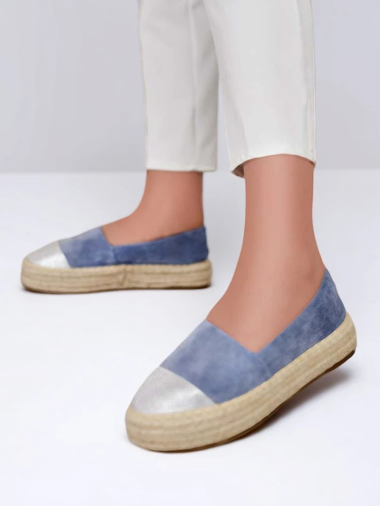• Espadrilles uniques pour femme en cuir éco-daim et semelle intérieure en tissu. Semelle plate décorée d'un cordon de jute pour plus de confort. Modèle à enfiler. Un complément parfait aux styles d'été !
