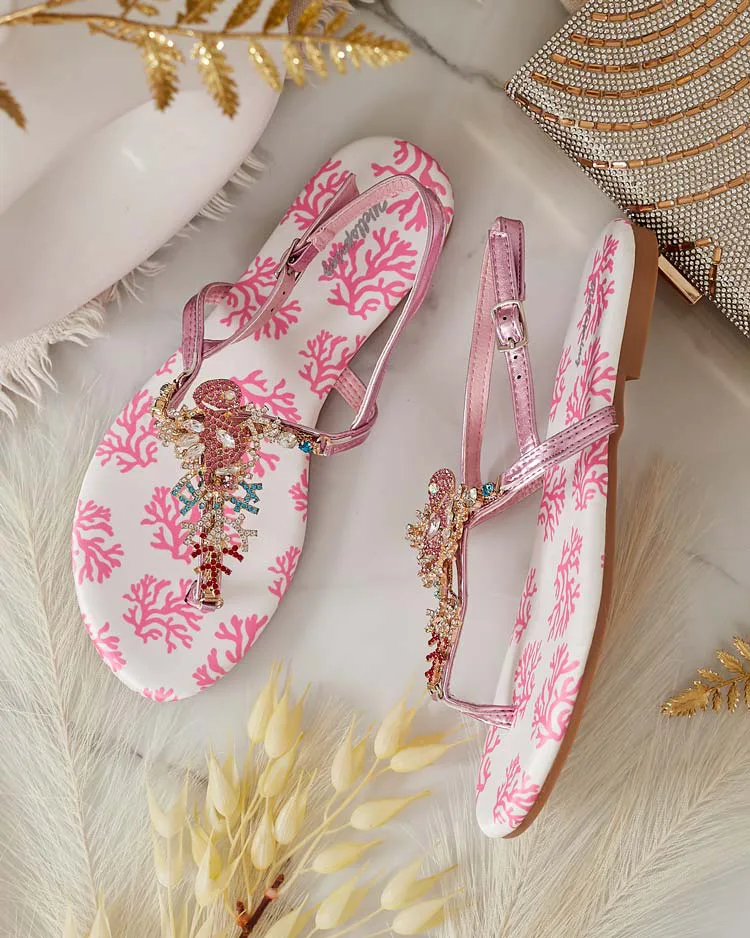 • Sandales à tongs plates pour femme à la mode, entièrement fabriquées en cuir écologique. Fermées par une boucle avec des décorations de boucle qui ajoutent de la subtilité. Parfaites pour les promenades estivales et les occasions spéciales !