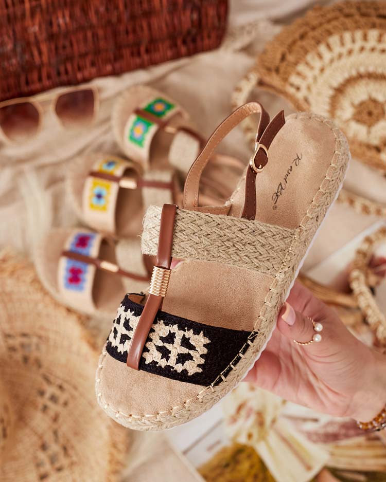 - Les sandales à semelle plate pour femme ont des brides en tissu et une semelle intérieure en cuir écologique. Les chaussures pour femmes présentées sont fermées par une boucle. Elles tiennent bien au pied !
