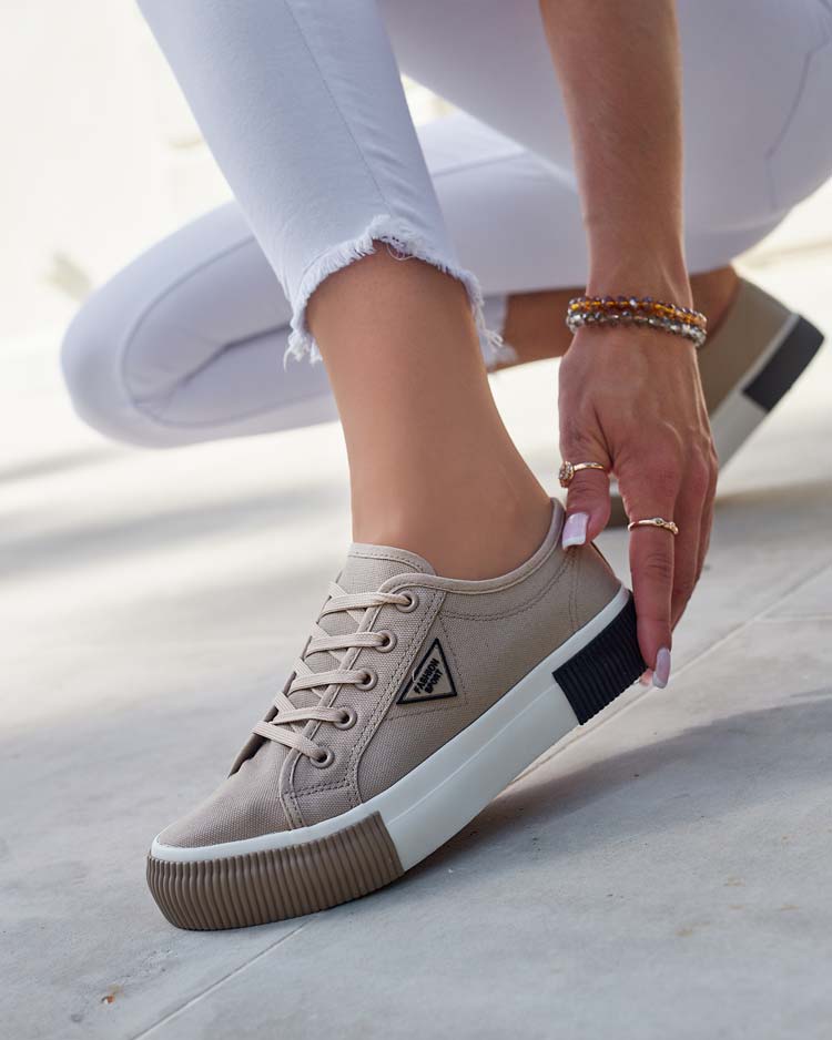 - Chaussures de sport décontractées pour femme dans le style des baskets sur une semelle plate. Dessus lacé en tissu. Semelle intérieure en tissu. Idéales pour les promenades estivales !