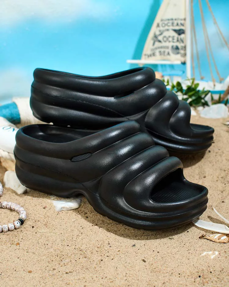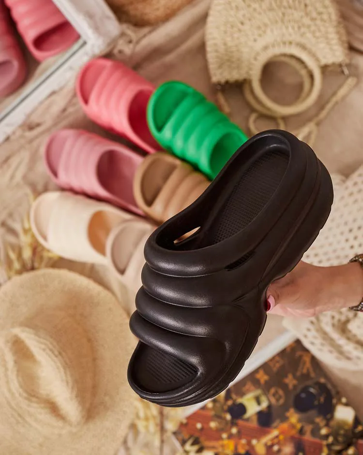 - Magnifiques tongs en caoutchouc pour femme sur une semelle plus épaisse. Le modèle a une forme générale asymétrique qui ajoute à leur style. Un choix parfait pour la maison, le jardin et les vacances !
