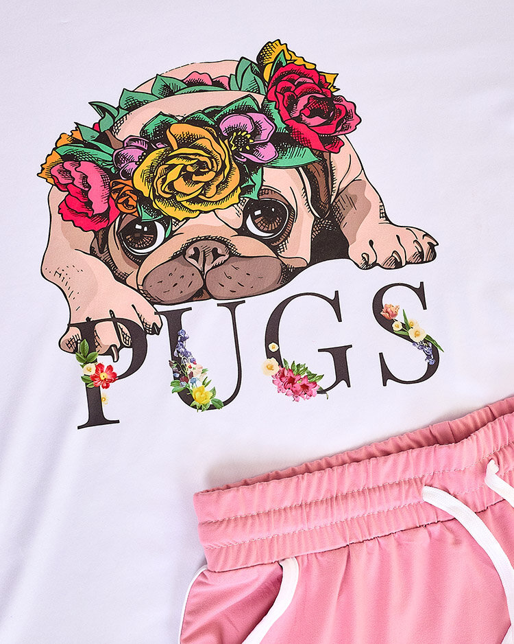 - Ensemble pour femme en matière agréable. Le modèle est imprimé d'un chien. Chemisier à manches courtes et short à taille élastique. Sentez l'été dans cet ensemble magnifique !