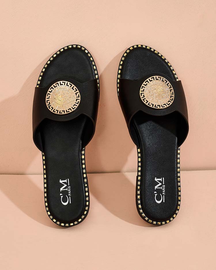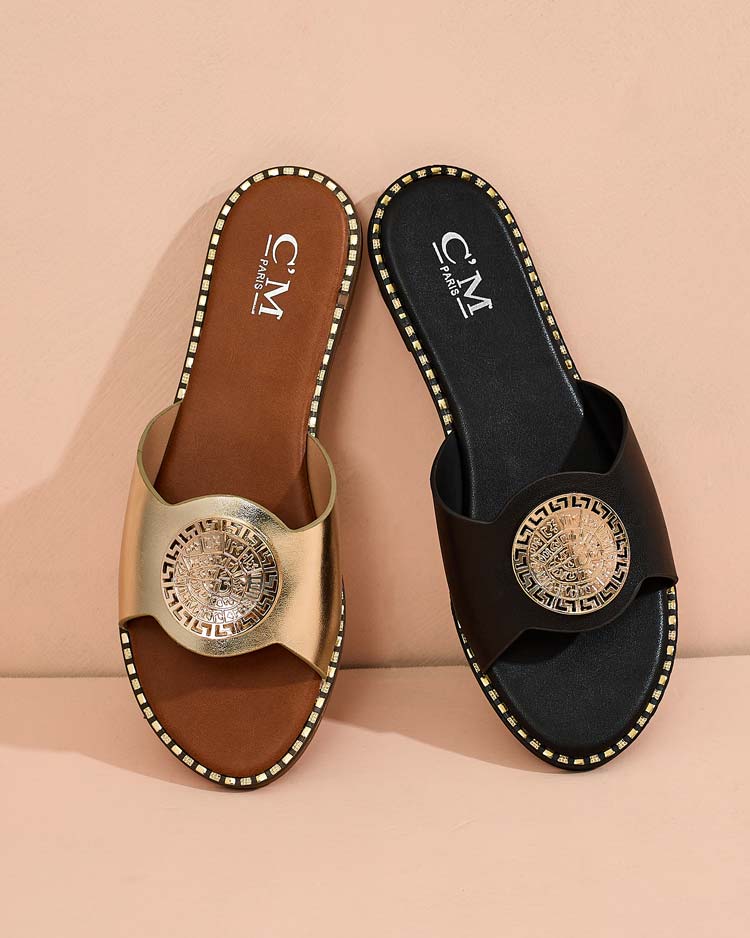 - Superbes tongs à semelle plate pour femme. Entièrement en cuir écologique. Elles ont une décoration subtile sur le dessus. Un choix parfait pour les vacances !