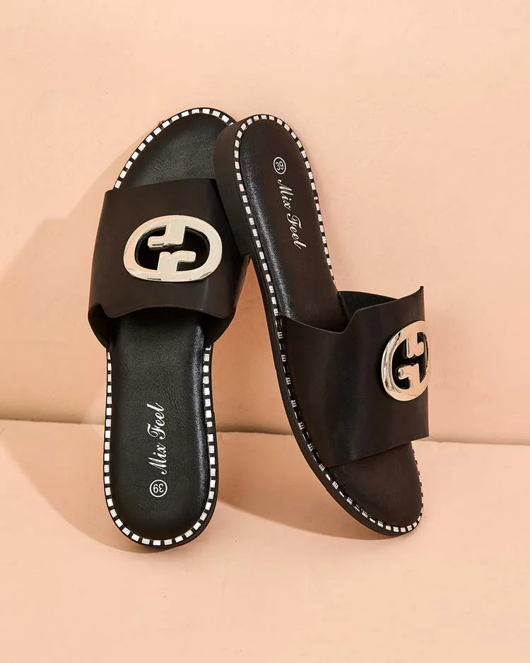 • Superbes tongs à semelle plate pour femme. Entièrement en cuir écologique. Elles ont une décoration sur le dessus. Un choix parfait pour les vacances !