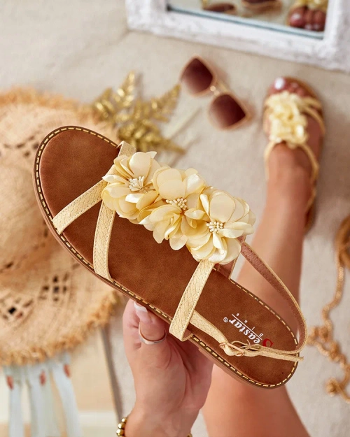 - Les sandales pour femme à tige décorative sont idéales pour les chaudes journées d'été. Le modèle est entièrement en cuir écologique. Les chaussures se ferment avec une boucle. A porter avec un short !