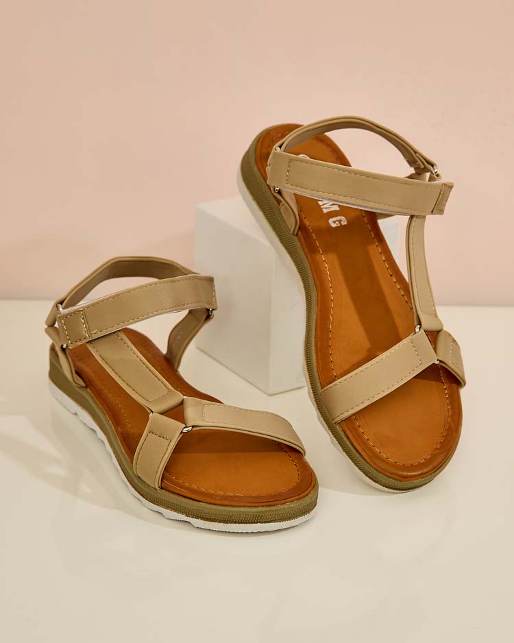 - Sandales pour femmes à semelle plate décorative. Elles sont fabriquées en tissu agréable, la semelle intérieure est en cuir écologique. Les chaussures se ferment avec du velcro. Parfaites pour créer des tenues d'été à la mode !