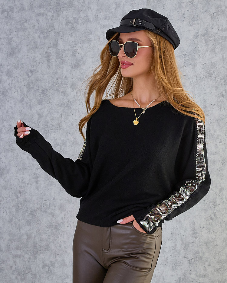 - Pull pour femme à encolure ronde en tissu agréable. Le modèle a des manches longues et est décoré de zircons. Incontournable de cette saison !