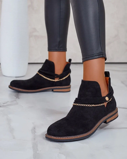 - Les bottes élégantes en éco-suède pour femme avec semelle intérieure en cuir naturel sont idéales pour les jours plus froids. Modèle à enfiler avec chaînes décoratives sur la tige. Chaussures à talon plat et bout rond. Superbe complément à vos tenues déco