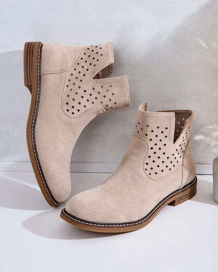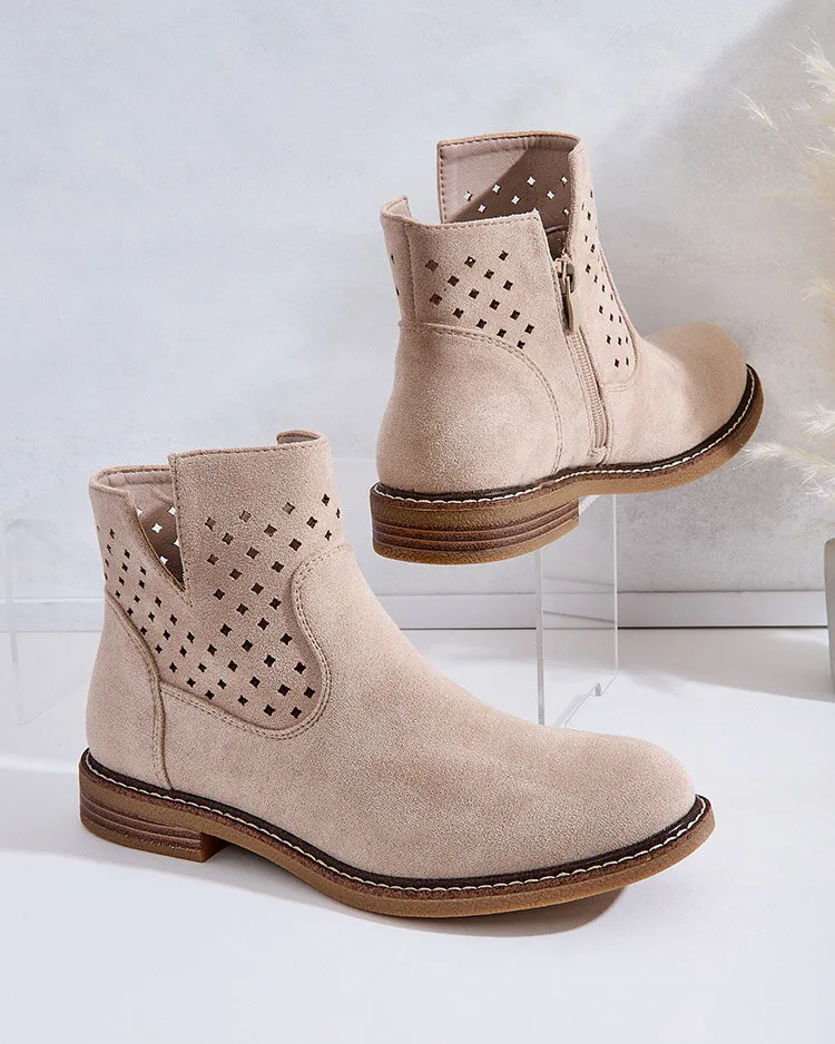 - Les bottes élégantes en éco-suède pour femme avec semelle intérieure en cuir naturel sont idéales pour les jours plus froids. La tige est fermée par une fermeture éclair. Modèle sur un talon plat et avec un nez rond. Super complément à vos tenues décontra