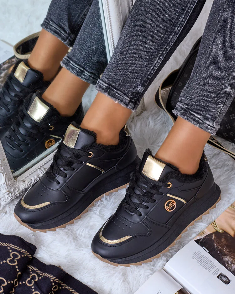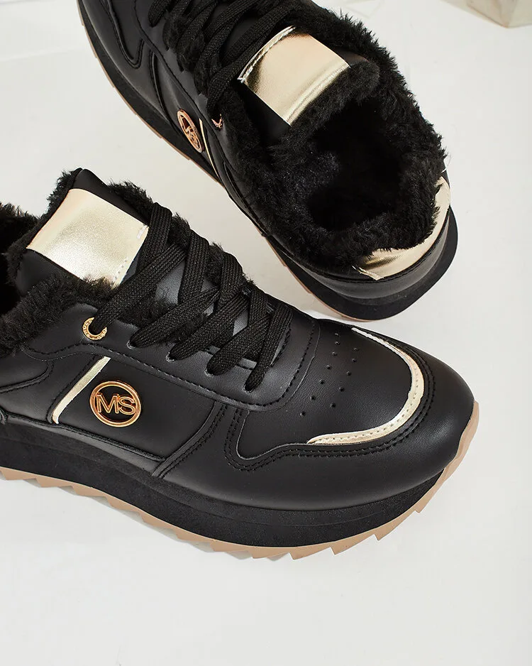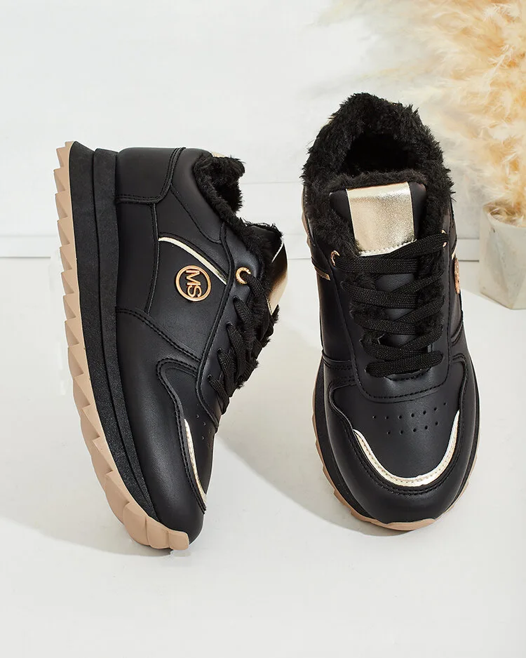 - Baskets sportives pour femme sur une semelle plus épaisse. Dessus lacé en cuir écologique. Intérieur entièrement isolé avec de la fourrure. Idéales pour les jours les plus froids !