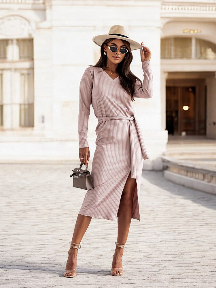 - Robe mi-mollet pour femme, avec manches longues et décolleté en cœur. Le modèle a un tissu côtelé et une élégante fente jusqu'à mi-cuisse. De plus, une ceinture est incluse. Incontournable de cette saison ! NOTE : Précision des mesures (+/-) 1 cm.