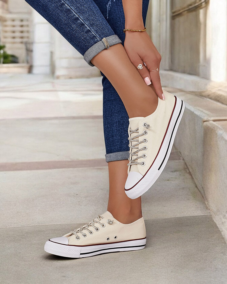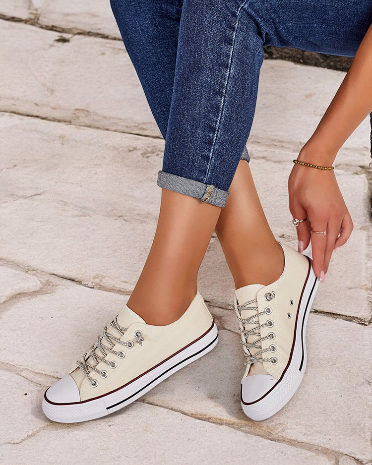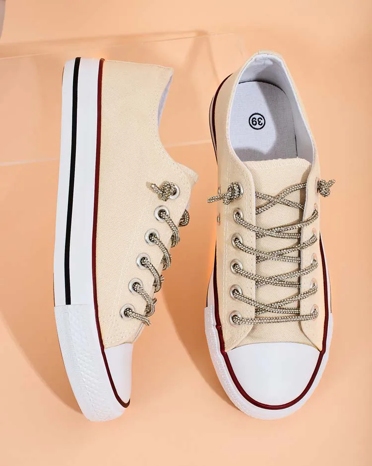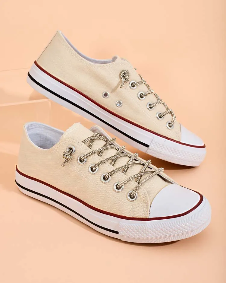 - Baskets pour femmes en tissu. Dessus avec lacets décoratifs. Semelle classique en caoutchouc. Ces chaussures seront parfaites pour tous les jours !