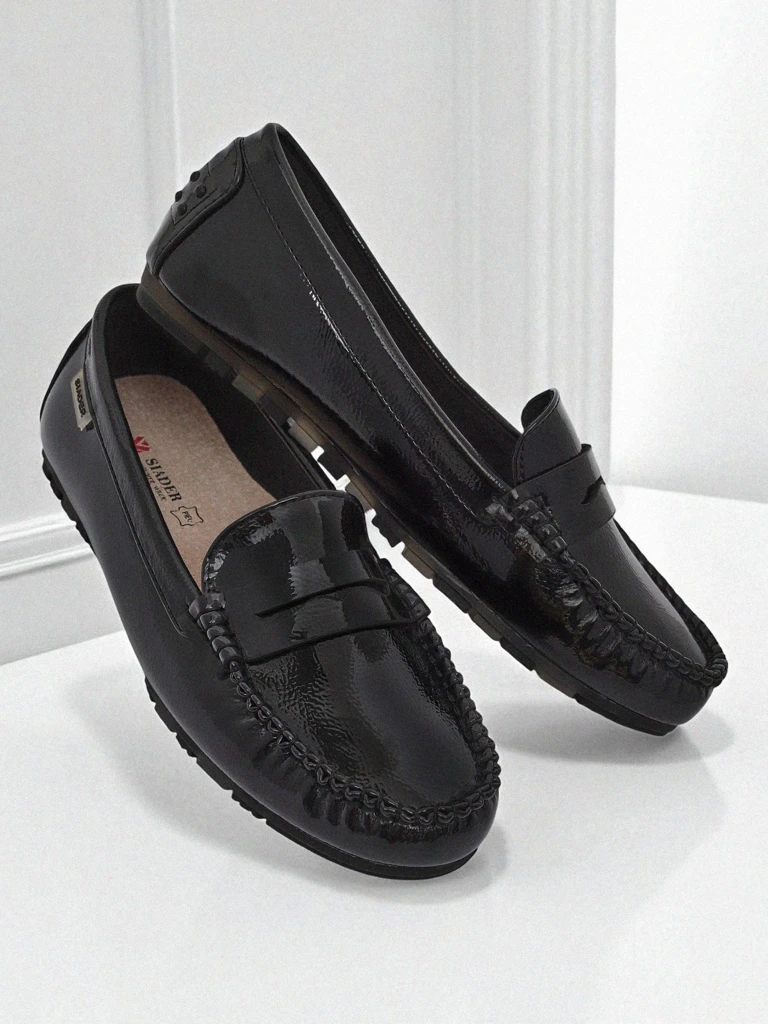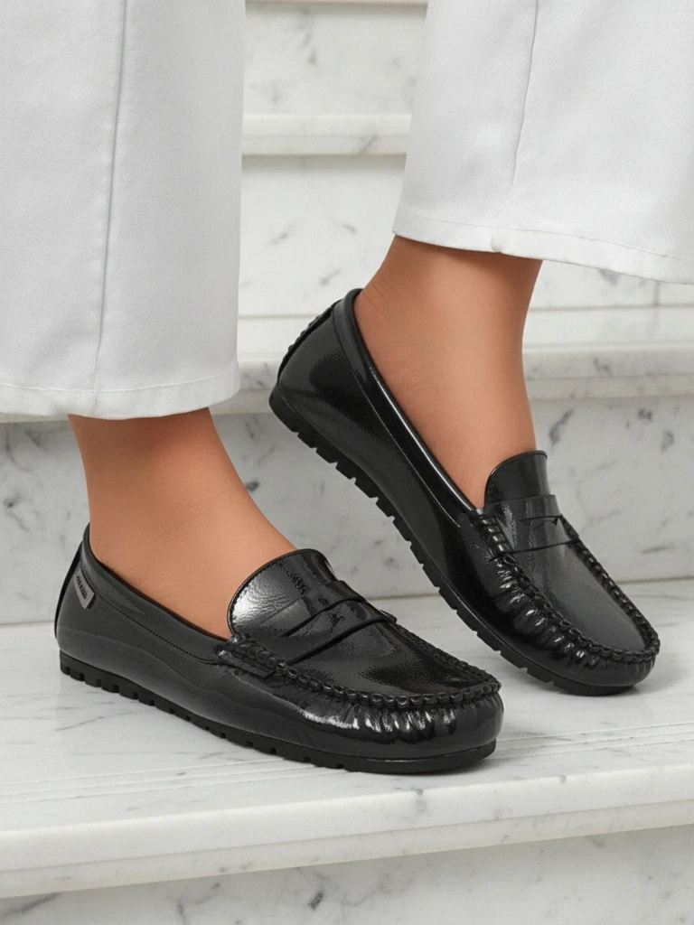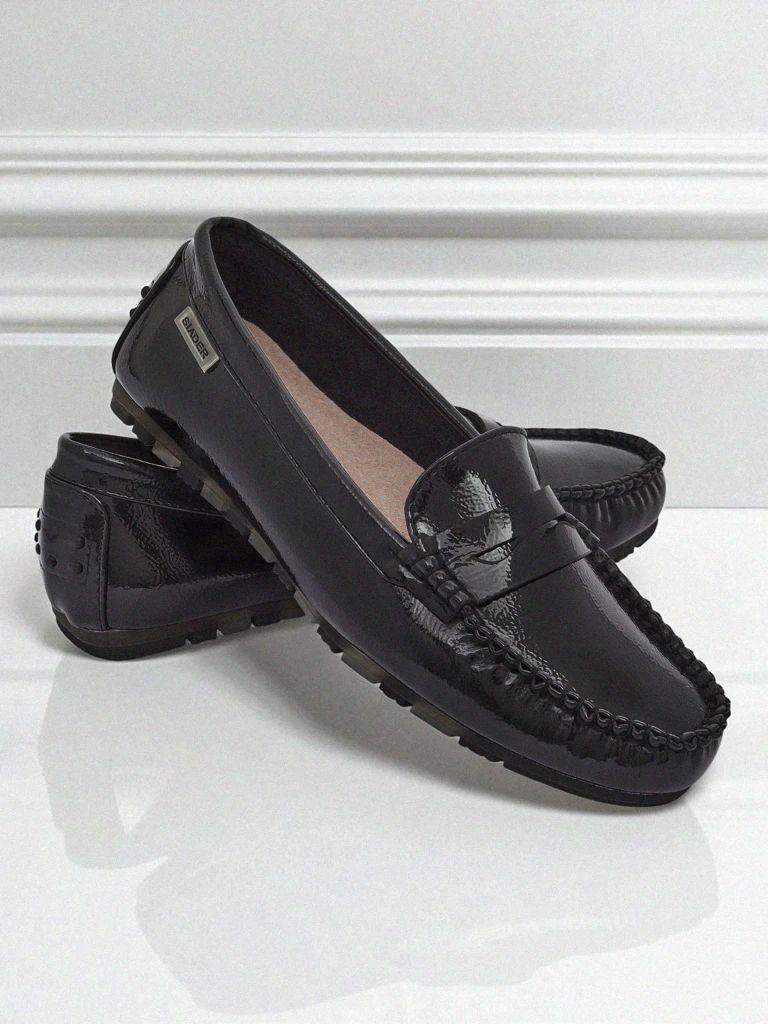 - Mocassins classiques pour femmes à semelle plate, en cuir écologique verni. Intérieur avec une semelle en cuir naturel avec des coussinets souples. Très légers et confortables !